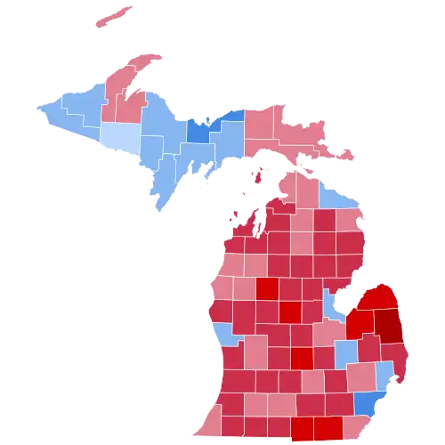 | Sanilac | 10,289 | 82.23% | 2,195 | 17.54% | 27 | 0.22% | 2 | 0.02% | 14 | 0.11% | 8,094 | 64.68% | 12,513 |