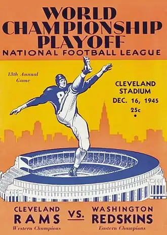 The 1945 NFL Championship Game was the 13th National Football League (NFL) championship game. Held on December 16, the Cleveland Rams defeated the Washington Redskins 15–14 at Cleveland Stadium in Cleveland, Ohio.[3][4][5][6][7] The Rams became the first expansion team to win an NFL championship.