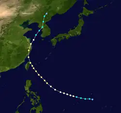 Pearl originated from a tropical depression located south of the Northern Mariana Islands on July 1. Developing into a tropical storm several hours later, further development occurred as Pearl tracked northwards, with it becoming a typhoon the next day. As a result, on July 4, Pearl peaked as a modern-day very strong typhoon with sustained winds of 90 knots (105 mph) Several days later, on July 6, Pearl made landfall 40 miles east of Shanghai, veering to the northwest. Weakening occurred after this landfall, and by the time Pearl struck what is now South Korea, it was a minimal tropical storm. A weakening Pearl tracked northwards before dissipating in Manchuria on July 8.[6]