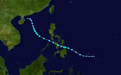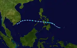 Elaine developed from an ill-defined easterly wave that passed south of Guam. Lack of sufficient data prevented accurate detection of the easterly wave east from Guam. As Elaine passed Yap, a surge of the monsoon winds to the south of the Inter-tropical trough intensified the wave and a weak circulation developed. The tropical storm moved at 12 knots until it passed over the northern tip of Mindanao; from this point a gradual recurvature toward the northwest was taken. A southerly flow in the South China Sea aided the intensification. The storm tracked within 60 miles of Manila and dissipated rapidly as it entered the China coast west-southwest of Hong Kong.[7]
