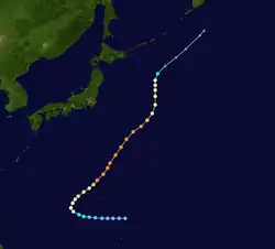 Faye was one of two storms that had its origin in the upper air, between 25 and 40 thousand feet, and gradually descended to the surface over the western edge of the Pacific high cell(indications of Kwajalein's upper winds verified the presence of an upper air low, and five days later its nearness to Iwo Jima was reflected on the surface) Faye, a moderate storm moved near and to the south of Iwo Jima and recurved around the Pacific high cell, 500 miles to the west of Iwo Jima. Faye followed a northerly path and passed over the western edge of Kyushu into the Japanese Sea.[7]