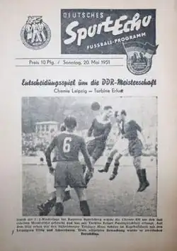 The championship play-off of the 1950–51 DDR-Oberliga took place on 20 May 1951 at the Ernst-Thälmann-Stadion in Chemnitz between Chemie Leipzig and Turbine Erfurt. The match decided the winner of the 1950–51 DDR-Oberliga, the 2nd season of the DDR-Oberliga, the top-level football league in East Germany. The match was necessary as both teams finished the season level on points. At the time, the rules stated that if this were to occur, a playoff would be necessary to decide the national champion. With a 2–0 victory, Chemie Leipzig secured the championship for their 1st national title.[1]