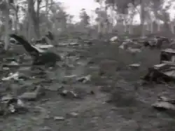 Investigators believed the aircraft captain survived for a short time after the crash. His body was a short distance away from his seat and both were a few metres ahead of the wreckage where they had been thrown after the nose of the aircraft was split open in the impact with a large tree. The seat belt had not broken, but it had been undone.[9] The captain's tunic was pulled up over his head as though to protect his face from the heat of the nearby inferno.[15] Investigators believed he initially survived the crash and undid his seat belt to drag himself away from the fire.[32] His body was not burnt, but the autopsy showed both his legs were broken and he died from a fractured skull.[9][8][33]