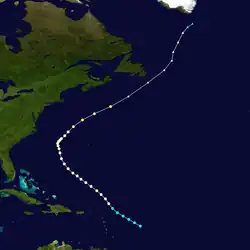 After crossing Cuba, Fox emerged into the Atlantic Ocean with winds of 100 mph (160 km/h), crossing central Andros and turning eastward though the Bahamas.[4] On New Providence, the hurricane dropped 13.27 in (337 mm) of rainfall,[21] Strong winds caused severe crop damage, leaving 30% of the tomato crop destroyed.[1] After briefly restrengthening to a major hurricane, Fox began a steady weakening trend. It turned abruptly to the north-northwest, followed by another turn to the northeast. On October 28, Fox was absorbed by a cold front west-southwest of Bermuda.[4][1]
