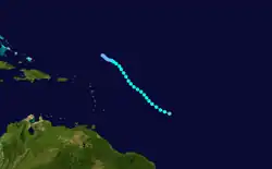 On September 18, a tropical wave exited the west coast of Africa, which spawned a tropical cyclone east of the Lesser Antilles on September 24. The system quickly intensified and was given the name Dog. The storm moved northwestward for its entire duration. On September 26, Hurricane Hunters observed winds of 78 mph (126 km/h), with gusts to 100 mph (160 km/h), although they were unable to locate a closed center of circulation. Operationally, Dog was upgraded to hurricane status, but a reanalysis in 2015 downgraded the storm to a peak intensity of 70 mph (110 km/h), making it a strong tropical storm. Dog began weakening on September 27, and over the next few days the circulation lost its definition. On September 29, Dog weakened to a tropical depression, and dissipated the next day.[1][4] The Weather Bureau advised ships to avoid the storm, but overall Dog did not affect land.[19]