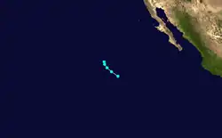 Ships reports from the Hawaiian Islands to Panama indicated that an area of disturbed weather formed just west of the Revillagigedo island group. Initially, evidence of closed wind circulation was insufficient to warrant an upgrade into a tropical disturbance. By the afternoon, pressures in the region began to fall. By that night, it was estimated to have developed winds of 40 mph (65 km/h).[3] A tropical storm formed on September 9;[6] meanwhile, ship reports indicated a pressure of 1,001 mbar (29.6 inHg) and sustained winds of 50 mph (85 km/h).[3] Maintaining peak intensity for a day, the low moved northwest before dissipating on September 10 as[6] barometric pressures began to rise. The remnants of the storm later brought rain to Central California on September 15.[3]