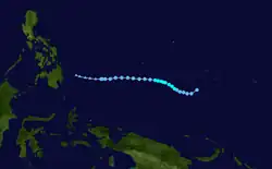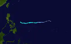 Irma formed on February 18, just near the International Date Line. The storm moved west over the following days, slowly increasing its speed before reaching its peak intensity on February 23. The storm quickly lost speed, then made landfall over the Visayas archipelago of the Philippines. On December 25, the storm dissipated just near the province of Iloilo.[1]