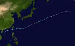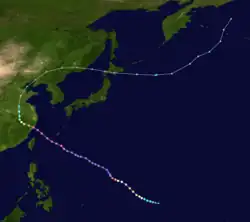 On June 25, Kit formed just south of the Philippines. Over the following days, the storm traverses west, then later northwest, having peak intensity on June 29. Kit later starts decreasing speed on July 1, then made landfall in Taiwan on July 3. The next day, Kit settles in China, curving north. The storm stayed in China over the following days, then made landfall on the Korea peninsula on July 5. The storm later makes landfall in Japan on July 7, then dissipated the following day.[6] Because of the storm, strong winds were recorded in Batanes, with widespread precipitation.[7] Other than rain, Kit destroyed a ship and damaged another.[8]