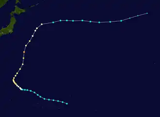 The Fleet Weather Central (FWC) and the Central Meteorological Observatory (CMO) began tracking a system west of the Marshall Islands on October 11. It slowly strengthened while moving west-northwest, slowing near Guam. After October 15, Alice turned northwest, intensifying further. It reached peak intensity near Iwo Jima on October 19 at 100 knots (though stronger winds near the eye were likely unobserved). Alice then weakened into a tropical storm, turning east and accelerating away from Japan. By October 22, near the International Date Line (IDL), it weakened to 35 knots. The CMO declared it extratropical six hours later as it crossed the IDL. The cyclone restrengthened to 60 knots by October 23, when the FWC ceased tracking.
