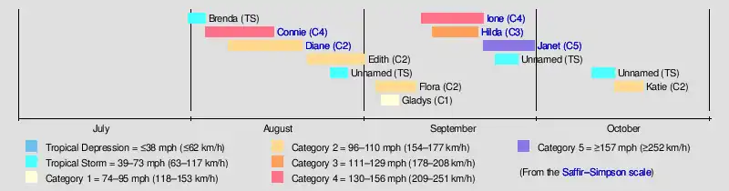 The Atlantic hurricane season officially began on June 15, 1955.[6] It was an above average season in which 13 tropical cyclones formed. In a typical season, about nine tropical storms develop, of which five strengthen to hurricane strength. All thirteen depressions attained tropical storm status, and eleven of these attained hurricane status.[4] Six hurricanes further intensified into major hurricanes.[7] The season was above average most likely because of a strong, ongoing La Niña.[8] Hurricane Alice was named in January 1955 but was operationally analysed to have developed in late December 1954.[9] Within the official hurricane season bounds, tropical cyclogenesis did not occur until July 31, with the development of Tropical Storm Brenda. However, during the month of August, four tropical cyclones formed – including Connie, Diane, Edith, and an unnamed tropical storm. Five additional tropical cyclones – Flora, Gladys, Hilda, Ione, and Janet – all developed in September. Tropical cyclogenesis briefly halted until an unnamed tropical storm formed on October 10.[4] The final storm of the season, Katie, dissipated on October 19,[7] almost a month before the official end of hurricane season on November 15.[6] Eight hurricanes and two tropical storms made landfall during the season and caused 1,603 deaths and $1.1 billion in damage.[4]