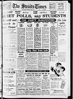 The 1955 election was significant in setting the stage for the self-governance of Singapore. It introduced a partially elected government responsible for internal affairs, though the British colonial authorities retained control over external affairs, defence and internal security.[1][2] With more than 300,000 registered voters, the 1955 election saw a significant surge in voter registration compared to the 1948 and 1951 elections. However, voter turnout remained relatively low at 52.66%.[4][6] The outcome of the election underscored the fragmentation and diversity of political opinion at the time as well as the rising tide of anti-colonial sentiment that would shape Singapore's future political trajectory.[7]