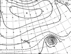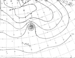 Although at an unusual latitude, the storm maintained this intensity for over a day before weakening to a tropical storm.[2] During the afternoon of August 13, the small system re-intensified into a hurricane. Reconnaissance reported that gale-force winds extended no more than 100 mi (160 km) from the storm's eye.[3] Shortly thereafter, the system further intensified into a Category 2 hurricane, attaining maximum winds of 105 mph (170 km/h).[2] Weather maps at the time depicted the storm as having a minimum pressure of 987 mbar (hPa).[3] By August 14, the storm began to weaken once more, gradually becoming a tropical storm on August 15. After turning northward, the cyclone became extratropical at a high latitude of 39.8°N.[2][3]