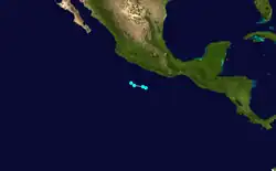The shortest lived storm of the season, Tropical Storm Nine, formed south of Mexico on September 26. The system attained peak winds of 50 mph (80 km/h) during its existence. Later that day, the center of the storm relocated several dozen miles to the west. Shortly thereafter, the storm dissipated on September 27 over open waters.[2]