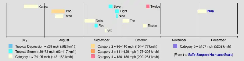 During 1957, tropical storms that formed in the Eastern Pacific region, east of 140°W, were not given names by the local warning center. Those that formed in the Central Pacific, between the International Dateline and 140°W, were named by the National Weather Bureau in Honolulu, Hawaii, as follows: Kanoa, a Hawaiian name; Della and Nina, from the Western Pacific typhoon naming list.[17] No names were retired from either region following the season.
