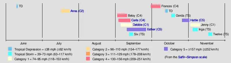 Tropical cyclogenesis began with an initially unclassified tropical depression, which developed on June 10.[6] More than a month later, Hurricane Anna formed on July 17 and dissipated on July 24. Thereafter, no other systems developed in July or the month of August.[3] A lack of cyclonic activity in the Atlantic basin in August is rare, with such phenomenon not occurring again until the 1997 and 2022 seasons.[7] The Atlantic basin remained dormant until Hurricane Betsy developed on September 2. During the next four days, two other tropical cyclones formed – Carla and Debbie. On September 11, the three storms – Betsy, Carla, and Debbie – existed simultaneously as hurricanes,[3] the most in a single day since 1893 and until 1998.[8] Esther, which developed on September 10, did not reach hurricane status until September 12. Later that day, a tropical storm that went unnamed formed over the Bahamas and moved across the East Coast of the United States for its brief duration.[3][9]