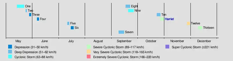 | Harriet | October 26–30 | Severe Cyclonic Storm | 100 km/h (60 mph) | 990 hPa (29.23 inHg) | Andaman Islands, East Pakistan, India, Malaysia, Myanmar, Thailand | ≥$34.5 million | ≥50,769 | |