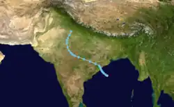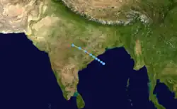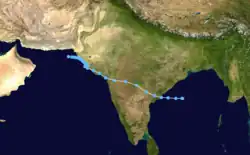 Deep Depression Seven existed from September 8 to September 15.[9] The storm moved from east to west throughout its lifetime. It formed on September 8 in the western Bay of Bengal and made landfall on eastern India on September 8. The depression crossed India and traced the western coast of the country from September 10 to September 14, making two sharp turns along the way. The storm dissipated in the extreme northern Arabian Sea on September 15.
