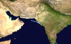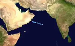 Depression Three existed from May 28 to May 30.[5] The tropical depression moved from east to west, forming early on May 28 in the middle of the Arabian Sea, moving west-northwestward throughout its entire lifetime. After maintaining its intensity for two days, the storm dissipated a few miles off the east coast of Oman. The storm was a tropical depression-equivalent storm at peak intensity, with 1-minute sustained winds of 30 miles per hour or 45 kilometers per hour.
