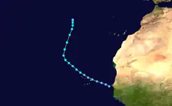 A tropical wave emerged into the Atlantic Ocean from the west coast of Africa on September 5.[8]: 183 The wave quickly developed into a tropical depression at 06:00 UTC on September 5, while located about 40 mi (64 km) west of Dakar, Senegal.[3] Shortly later, the depression produced squally weather in Cape Verde.[8]: 183 The depression then re-curved northwestward and began to intensify. At 00:00 UTC on September 7, the depression strengthened into Tropical Storm Florence. About twenty four hours later, the storm attained its maximum sustained wind speed of 45 mph (72 km/h). Florence then curved north-northeastward later that day and slowly weakened.[3] A reconnaissance aircraft reported that Florence degenerated into an area of squalls to the south of the Azores at 06:00 UTC on September 10.[3][8]: 183
