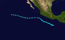 On June 4, a tropical depression formed 585 miles (941 km) southwest of Acapulco, Mexico Early the next day, the depression system intensified into the first tropical storm of the season and was named Victoria. At that time, the storm was at its peak intensity of 50 mph (80 km/h) which it retained while moving the northwest. Early on June 7, the tropical storm weakened into a tropical depression before dissipating six hours later. [1] In all, Tropical Storm Victoria stayed at sea.