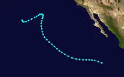 During the afternoon of August 7, a tropical depression formed 150 miles southwest of Cabo San Lucas, Mexico. On August 8, the cyclone strengthened into Tropical Storm Claudia. At that time, Claudia was reaching its peak intensity of 50 mph (80 km/h), while also beginning to recurve to the north. The storm remained at peak intensity while re-curving until August 10 when the wind speeds decreased slightly and advisories were discontinued. [1] The storm never affected land.