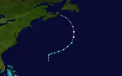 A tropical wave spawned a tropical depression west of the Leeward Islands at 00:00 UTC on July 13. Six hours later, ship reports indicated that the depression strengthened into Tropical Storm Celia. However, because satellite imagery showed only a weak swirl with convection sheared well to the southeast, Celia degenerated back to a tropical wave early on July 14 north of Puerto Rico while moving westward. While nearing the central Bahamas late on July 18, the remnants of Celia regenerated into a tropical depression after regaining a low-level circulation. That day, Celia turned northward back into the open Atlantic. Observations from a ship indicate that Celia re-strengthened into a tropical storm early on July 20 as it accelerated northeastward ahead of a frontal boundary. The storm intensified significantly throughout the day, reaching hurricane status at 18:00 UTC. Celia then peaked with sustained winds of 75 mph (121 km/h) and a minimum pressure of 994 mbar (29.4 inHg). The cyclone soon began to weaken, falling to tropical storm intensity at 06:00 UTC on July 21. Six hours later, Celia transitioned into an extratropical cyclone, which struck eastern Nova Scotia late on July 21 and then dissipated over Labrador on the following day.[12]