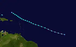 On September 26 and September 27, satellite imagery and ships monitored an area of disturbed weather located to the east of the Lesser Antilles and following Hurricane Inez. Based on reports of a circulation,[5] the system developed into a tropical depression at 00:00 UTC on September 27. The depression intensified slowly and became Tropical Storm Judith around midday on September 28. While centered north of Barbados the next day, Judith attained its peak intensity with maximum sustained winds of 50 mph (80 km/h) and a minimum barometric pressure of 1,007 mbar (29.7 inHg),[6] both of which were observed by a reconnaissance aircraft flight.[5] Shortly thereafter, the storm crossed through the Windward Islands and weakened to a tropical depression, possibly due to entering the outflow of Inez. At 12:00 UTC on September 30, Judith dissipated over the eastern Caribbean Sea.[6] Winds up to 37 mph (60 km/h) were observed on Martinique.[5]