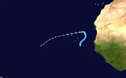 A tropical wave moved off the western coast of Africa on October 2 and spawned an area of disturbed weather that steadily organized as it moved northward between Africa and Cabo Verde. It became a tropical depression at 12:00 UTC on October 3 and maintained that strength for a few days. On October 7, a ship measured 40 mph (64 km/h) winds, the impetus for upgrading the depression to Tropical Storm Kendra. The organized nature of the system on satellite imagery suggested it may have become a tropical storm as early as October 4, but the sparsity of observations precluded an upgrade. The cyclone curved toward the southwest and began to weaken as its convection dissipated. At 00:00 UTC on October 10, it degenerated to a remnant low which dissipated into an open trough over the central Atlantic the next day. Kendra has been the focus of multiple analyses, as it was originally classified as a tropical storm, revoked as a tropical cyclone in post-season review, and finally re-designated as a tropical storm during reanalysis.[12]
