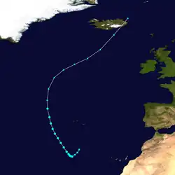 Re-intensifying into a Category 3 hurricane early on September 3, Faith then attained its peak intensity with maximum sustained winds of 120 mph (195 km/h) and a minimum barometric pressure of 950 mbar (28 inHg).[6] One person drowned in the western Atlantic after his ship sank.[5] Heavy rainfall and strong winds pelted Bermuda, though no damage occurred.[23] The storm resumed a northeastward motion and weakened to a Category 2 hurricane early on September 4, before becoming extratropical about 480 mi (770 km) east-southeast of Cape Race, Newfoundland. The extratropical remnants continued northeastward and later east-northeastward across the far north Atlantic. On September 6, the remnants of Faith passed near the Faroe Islands, several hours before striking Norway and crossing Scandinavia. Thereafter, the system meandered over the Soviet Union and the Arctic Ocean for the next several days, until finally becoming unidentifiable near Franz Josef Land on September 15.[6] Three other drowning deaths occurred in the North Sea near Denmark.[5] A fifth death occurred after a man succumbed to injuries sustained during a boating incident related to the storm.[24] In Norway, heavy rainfall from the storm caused record high glacier melting, flooding some areas.[25]