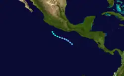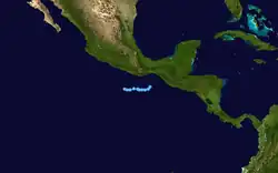 Six days after Joyce's dissipation, a tropical depression formed north of the Intertropical Convergence Zone on the evening of August 25.[8][9] The storm was then named Tropical Depression Sixteen-E. It took an extended amount of time, about three days before it intensified into a tropical storm.[10] The storm was designated as Tropical Storm Kirsten.[11]