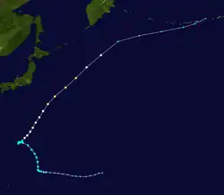 A low-pressure system formed in the western Pacific on August 21. Initially drifting west-northwest, the system slowly developed and intensified to tropical storm status by August 28. It was named Betty. Betty reached peak intensity on August 30. Betty then turned northeastward, and made landfall near Yeosu, South Korea, on August 30 as a tropical storm. It later transitioned to an extratropical cyclone on September 1 and dissipated on September 4. No significant damage or casualties were documented, attributed to its moderate strength and landfall in less populated regions.