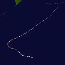 The incipient disturbance that became Super Typhoon Kit was first identified on June 20 near Chuuk State in the Federated States of Micronesia.[14] The JMA designated that system as a tropical depression that day as the system moved steadily westward.[15] The JTWC followed suit with this classification on June 22 following an investigation by reconnaissance. Early the next day, the depression acquired gale-force winds and was dubbed Tropical Storm Kit. Turning to the northwest, Kit developed a 35–55 km (22–34 mi) wide eye and reached typhoon status late on June 23.[14] Rapid intensification ensued late on June 24 into June 25; Kit's central pressure dropped 51 mbar (hPa; 1.5 inHg) in 18 hours from 965 mbar (hPa; 28.50 inHg) to 914 mbar (hPa; 26.99 inHg).[16] During this time, Kit's eye contracted to 13 to 17 km (8.1 to 10.6 mi).[14] At 06:00 UTC on June 26, the JMA estimated Kit's pressure to have abruptly dropped to 880 mbar (hPa; 25.99 inHg),[15] which would rank it among the top ten most intense tropical cyclones on record.[17] Around this time, the JTWC estimated Kit to have attained peak winds of 315 km/h (195 mph);[16][18] however, these winds are likely an overestimate.[1] A later reconnaissance mission on June 26 reported a pressure of 912 mbar (hPa; 26.93 inHg), the lowest observed in relation to the typhoon.[14] Weakening ensued thereafter as the system accelerated to the north-northeast. Retaining typhoon strength, Kit brushed southeastern Honshu, Japan, on June 28, passing roughly 155 km (96 mi) east of Tokyo. The system subsequently weakened to a tropical storm and transitioned into an extratropical cyclone south of Hokkaido on June 29.[16] The National Oceanic and Atmospheric Administration reported the remnants of Kit to have dissipated the following day near northeastern Hokkaido.[19] However, the JMA states that the system turned eastward and accelerated over the north Pacific before losing its identity on July 3 near the International Date Line.[15]