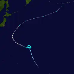 A tropical depression formed in the western Pacific on July 27. Over the next 48 hours, it tracked west-northwestward, intensifying into a tropical storm by July 29. This early phase featured steady organization, with central pressure dropping to 989 hPa by July 30. Georgia reached its peak intensity on August 1–2, with maximum sustained winds of 60 knots (110 km/h) and a central pressure of 982 hPa. The storm then executed a gradual northeastward recurvature east of the Bonin Islands. By August 2, it accelerated toward higher latitudes, maintaining tropical storm strength.