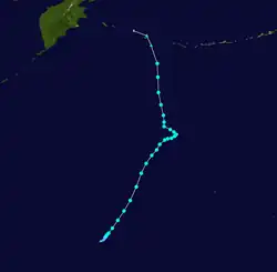 After recurving, Georgia traversed the open Pacific north of 30°N. By August 4, it weakened to a tropical depression, with winds dropping below 35 knots. The system transitioned into an extratropical cyclone by August 8, ultimately dissipating near the Kuril Islands on August 13.
