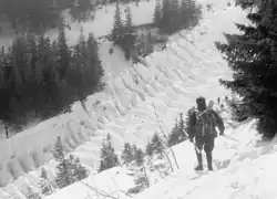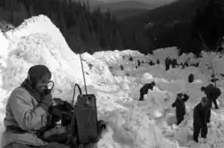 A rescue team from Czechoslovakia arrived with a dog trained to search for avalanche victims.[5] One of the Czech rescuers had been rescued from a similar avalanche by Polish Mountain Volunteer Search and Rescue members two years earlier.[6] The Czech team entered the Polish side under the responsibility of the commander of the Border Protection Forces post "Nad Śnieżką".[11] The first avalanche victims were located by the Czech dog. The rescuers followed, using probes, and then followed with shovels to dig through the areas marked by black flags. The extracted victims were first transported to a military tent and then to a morgue. Due to a lack of toboggans, the bodies were carried on skis tied together with a rope.[6]