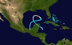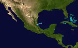 A tropical wave developed into a tropical depression near the Windward Islands on August 29.[2][4] Initially, the depression slowly strengthened while moving west-northwestward and was upgraded to Tropical Storm Francelia until more than 24 hours later. While located north of Honduras, it curved west-southwestward and was upgraded to a hurricane on September 1. Late on September 3, Francelia made landfall near Punta Gorda, Belize with winds of 100 mph (160 km/h). The storm quickly weakened inland, and less than 24 hours later, it dissipated over northern Guatemala.[2] However, the remnants of Francelia later contributed to the development of Hurricane Glenda in the eastern Pacific Ocean.[4]