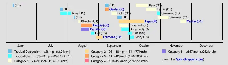 Tropical cyclogenesis began early, with a tropical depression that affected Jamaica. Activity briefly went dormant between June 15 and July 25, when the next depression originated. That same day, the season's first named storm, Anna, developed over the eastern Atlantic. There were five tropical cyclones that formed in the month of August – Blanche, Camille, Debbie, Eve, and Francelia. Camille was the most intense tropical cyclone of the season, peaking as a Category 5 hurricane with maximum sustained winds of 175 mph (282 km/h) and a minimum barometric pressure of 900 mbar (27 inHg).[2]