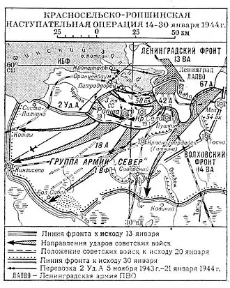The offensive began on January 14. The final offensive concept required the 2nd Shock and 42nd Armies to penetrate the German defenses along the eastern flank of the bridgehead and near Pulkovo southwest of Leningrad, link up at Ropsha, and encircle and destroy the German forces in the Krasnoye Selo, Ropsha, and Strelna regions. After capturing these initial objectives the two Armies were to advance southwest toward Kingisepp and south toward Krasnogvardeysk. The 108th Corps and the 152nd Tank Brigade were in second echelon of 2nd Shock, and were to strengthen the offensive by attacking toward Krasnoye Selo in case the initial assault failed. Otherwise, it was to initiate a pursuit to the south.[48]