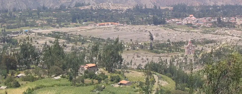 In the late 1960s, Yungay's permanent population was around 4,000[9] or 5,000,[10] which swelled greatly on market and church days when thousands of visitors arrived from the surrounding villages.[9] With the notable exception of the massive stone cathedral at the center of town, the city consisted predominantly of two or three-story adobe and wood structures with heavy tile roofs, dating from the Spanish colonial period.[5] This fragile housing stock, typical of structures elsewhere in the Río Santa valley, was highly vulnerable to seismic activity.[5] Other prominent features of Yungay included the central Plaza de Armas surrounded by palm trees, which hosted events including the fiesta of Santo Domingo, and the elevated cemetery, which was actually built on top of a pre-Inca burial mound which may be as old as 10,000 years.[11]