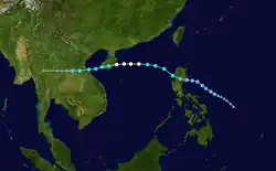 On April 23 Tropical Storm Wanda began its life to the east of the Philippines. It tracked over the archipelago, and emerged into the South China Sea on the 25th. It turned to the northwest, and became a typhoon on May 1 just off the coast of South Vietnam. The westerlies brought Wanda to the north and northeast, where it weakened until dissipating on the 4th near Hainan Island.