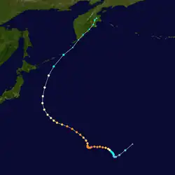 During January 8, the JMA started to monitor a tropical depression that had developed, about 500 km (310 mi) to the east of Ngerulmud, Palau.[3] Over the next day the system gradually developed further as it moved north-westwards, before it was classified as a tropical storm and named Sarah by the JTWC, after a US Navy plane had found an organised system.[3][4] The system subsequently recurved north-eastwards, before it was classified as a Severe Tropical Storm by the JMA during January 10.[5] During that day, the JTWC reported that the system had peaked, with 1-minute sustained wind-speeds of 95 km/h (60 mph).[4] Over the next day, the system quickly weakened and became an extratropical cyclone during January 11.[4] Sarah's extratropical remnants were subsequently tracked as they moved north-eastwards, until it made landfall on Canada and broke up over the mountains of British Columbia during January 17.[4]