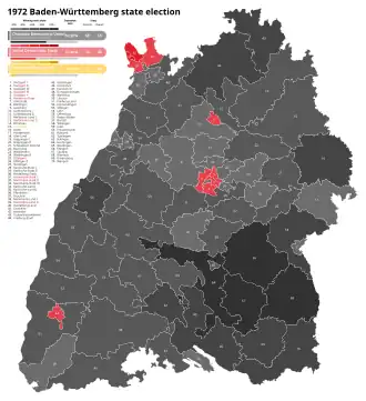 - ^ "Endgültige Ergebnisse der Wahl zum Landtag von Baden-Württemberg am 23. April 1972" (PDF) (in German). Statistisches Landesamt Baden-Württemberg. 1972-05-09. Retrieved 2025-05-19.
