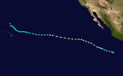 An area of disturbed weather was witnessed well south of mainland Mexico on August 18.[7] The system developed into a tropical storm on August 20. It slowly strengthened, moving generally west-northwest, and became a hurricane on August 22. It continued strengthening, and was briefly a Category 3 major hurricane on 24. Fernanda weakened after that, and it was a tropical storm by the time it crossed 140°W and entered the central Pacific.[4] It remained at a steady intensity until it rapidly weakened when north of Kauai on September 1. A flash flood on Waipio Stream in the Big Island's Kohala Mountains may have been due to Fernanda. Other than that, this tropical cyclone caused no known impact.[5]