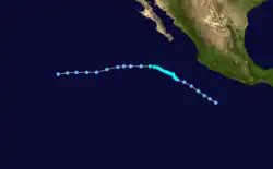 On October 18, a vortex in the Intertropical Convergence Zone was determined to be a tropical storm through the use of satellite pictures.[4] Kathleen was a tropical storm for only eighteen hours before weakening into a tropical depression and recurving to the northeast.[1] The tropical cyclone dissipated on October 19 while out to sea west of Puerto Vallarta. No deaths or damages were reported.[4]