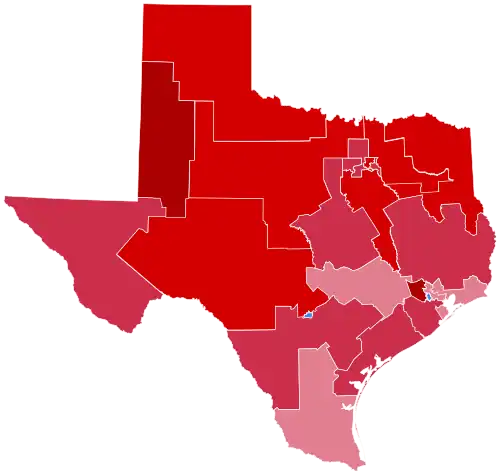 Nixon's win in Texas made him the first ever Republican presidential candidate to break sixty percent of Texas' popular vote in a presidential election, surpassing former President Dwight D. Eisenhower's performance of 55.26% in 1956, and even native son Lyndon B. Johnson's 63.32% in 1964. Nixon is so far the only Republican candidate to break 65% of the state's popular vote. At the county level, 246 of Texas' 254 counties voted for Nixon, all by wide margins except predominantly black Robertson County where Nixon won by a single vote. Nixon won 22 of Texas' 24 congressional districts – with the 18th (Harris County) and 20th (Bexar County) constituting the only congressional districts McGovern won anywhere in the former Confederacy. McGovern, however, did not win either county each of these districts were located in.