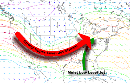 While violent tornado activity increased over the warm sector, a third band of convection developed at about 16:00 UTC and extended from near St. Louis into west-central Illinois. Based upon real-time satellite imagery and model data, differential positive vorticity advection coincided with the left exit region of an upper-level jet streak which reached wind speeds of up to 130 kn (150 mph) (66.9 m/s (241 km/h)), thereby enhancing thunderstorm growth.[11] Storms grew rapidly in height and extent, producing baseball-sized hail by 17:20 UTC in Illinois and, shortly thereafter, in St. Louis, Missouri, which reported a very severe thunderstorm early in the afternoon that, while not producing a tornado, was the costliest storm to hit the city up to that time.[12] By 19:50 UTC, supercells producing F3 tornadoes hit the Decatur and Normal areas in Illinois. As thunderstorms moved into the warmer, moister air mass over eastern Illinois and Indiana, they produced longer-lived tornadoes—one of which began near Otterbein and ended near Valentine in Indiana, a distance of 121 miles (195 km).[11]