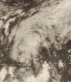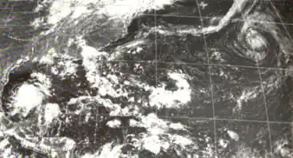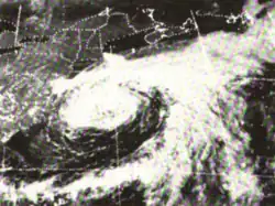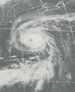 Doris made meteorological history when, on August 31, it became the first Atlantic hurricane ever to be upgraded to hurricane intensity solely on the basis of satellite pictures,[1] via the Dvorak technique.[7] The cyclone then curved northward and intensified further during the next few days, becoming a Category 2 hurricane early on September 2.[3] Based on the Dvorak technique, it is estimated that Doris peaked with maximum sustained winds of 110 mph (180 km/h) and a minimum barometric pressure of 965 mbar (28.5 inHg) shortly thereafter. By September 3, the hurricane began interacting with a non-tropical low pressure area.[7] On the following day, Doris quickly weakened to a tropical storm and transitioned into an extratropical cyclone about 830 mi (1,340 km) south-southeast of Cape Race, Newfoundland, around 06:00 UTC. The extratropical remnants weakened and then dissipated late on September 4.[3]