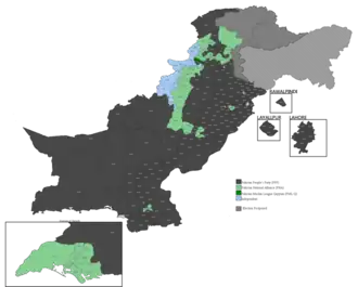 In 1976, nine religious and conservative parties formed a common platform, called the Pakistan National Alliance (PNA).[1] In January 1977, Prime Minister Bhutto immediately started campaigning after called for new general elections.[1] The PNA was united behind religious slogans and a right-wing political agenda.[1] The PPP, on the other hand, campaigned on a platform of social justice in agriculture and industry. Despite large turnouts at PNA campaign events and the establishment on PNA's circle, the results of the general elections showed the Pakistan Peoples Party winning 155 out of 200 seats in the National Assembly and the PNA winning only 36. Bhutto therefore gained a supermajority in the Parliament.[1]