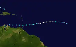 After the storm maintained peak winds for about 36 hours, the outer rainbands to the south and east of the center began diminishing late on January 21, which began a weakening trend.[12] At around that time, the cyclone was moving west-southwestward, and within 72 hours was forecast by one hurricane forecast model to be located over Hispaniola.[13] By midday on January 22, the winds decreased to below gale force after the convection dissipated near the center.[14] Subsequently, it turned more to the west away from land, and by January 23 the circulation degenerated into a remnant trough about 185 mi (298 km) north of the Lesser Antilles.[4] The storm was one of six tropical or subtropical cyclones on record to be active in the month of January, and one of four to have formed in the month.[15]