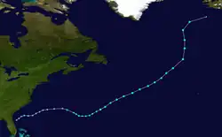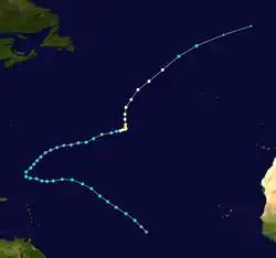 A tropical wave passed westward across Dakar, Senegal on August 31 and entered the Atlantic Ocean later that day. Convection markedly increased over the next few days and by 0000 UTC on September 4, the wave developed into a tropical depression while located about midway between Africa and the Lesser Antilles. Later that day, the Hong Kong Merchant reported tropical storm force winds, thus the depression was upgraded to Tropical Storm Flossie. It initially tracked northwestward at 23 mph (37 km/h) and minimal strengthening occurred, possibly due to rapid forward speeds. On September 5, the storm curved westward, until turning north on September 7. A high-pressure area transitioned into a trough, causing Flossie to re-curve northeastward and generating strong upper-level winds.[47]
